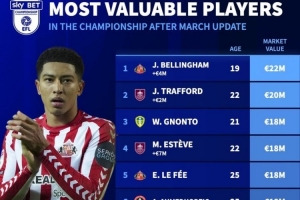 体育资讯3月28日讯 德国转会市场今日晒海报,列出英冠球员身价排名,小贝林厄姆2200万欧元居首。