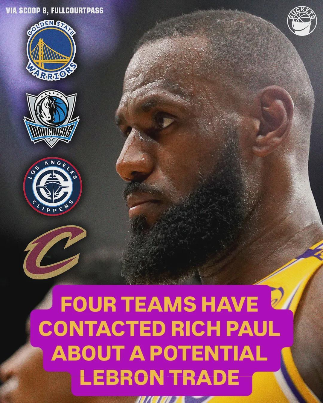 ESPN的戴夫麦克米伦表示,里奇保罗跟自己说,有四支不同的球队联系过他,探讨有关勒布朗詹姆斯的交易。现在,美媒也是爆出了这四支球队,分别是快船、勇士、独行侠和骑士。
